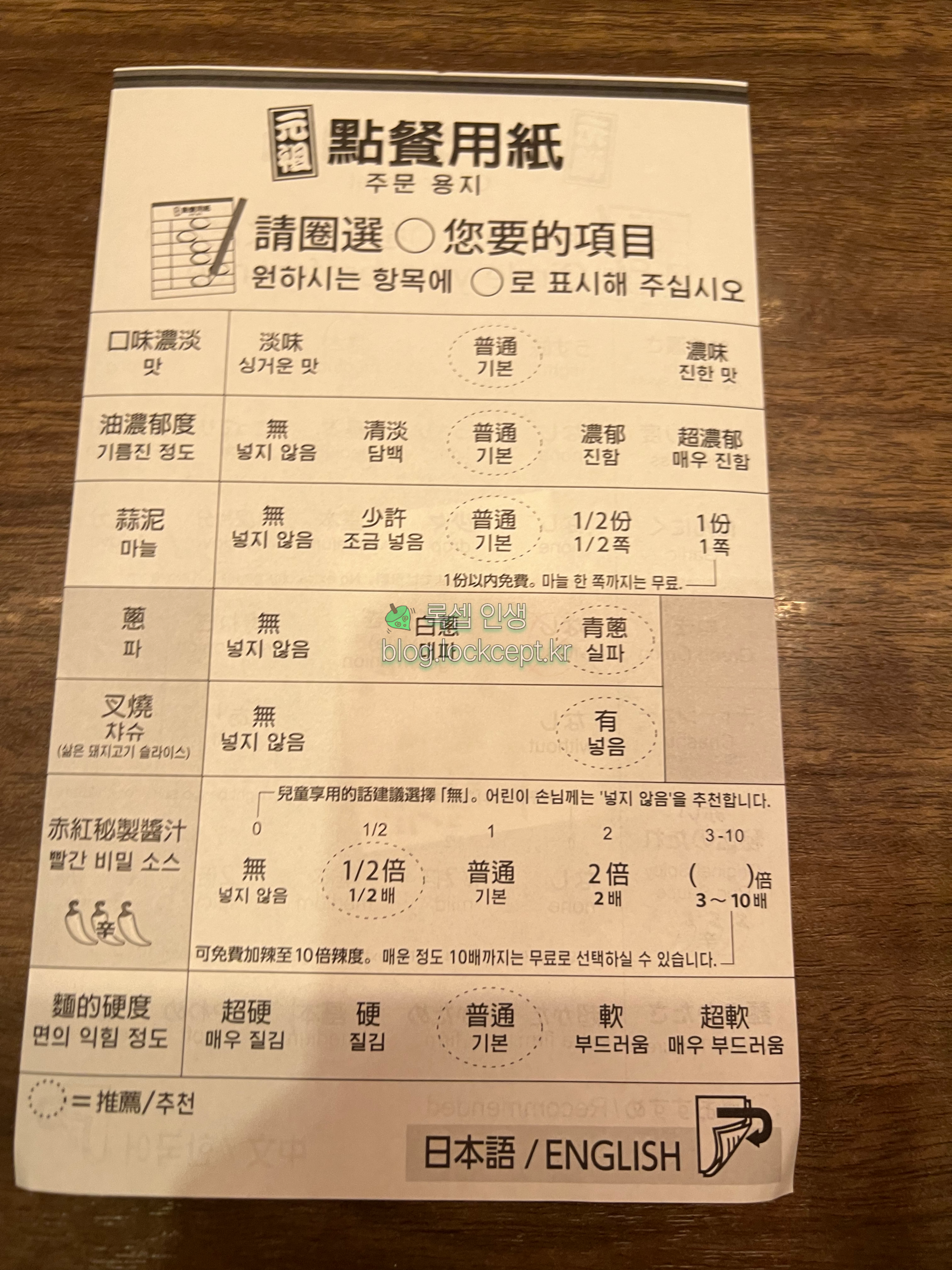 라멘 티켓과 함께 주문용지를 제출하면 된다. 뒷면에 번역이 되어있었으나 몰라서 살짝 고생했다.