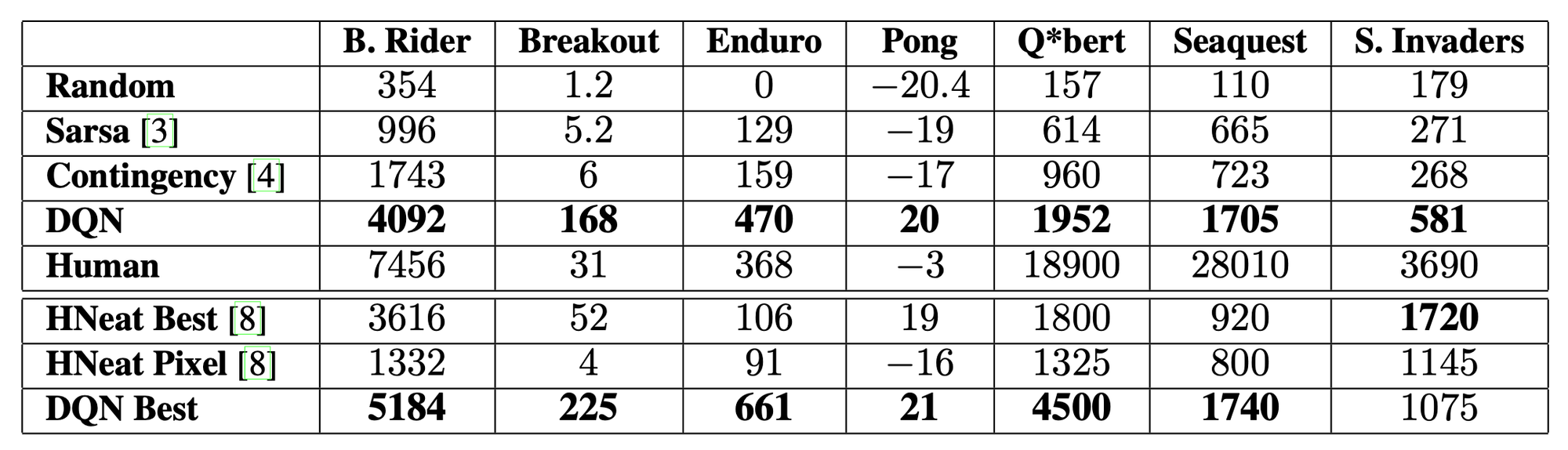 7개의 Atari 게임에 대해 위와 같은 성능을 보였다. 기존의 알고리즘 중 사전 지식을 가지고 화면 색상을 처리한 알고리즘이 있었던 반면, DQN 모델에 대해서는 raw input만을 사용했다. 그럼에도 불구하고 Breakout, Enduro, Pong에서 Human 보다 좋은 성능을 달성했다.