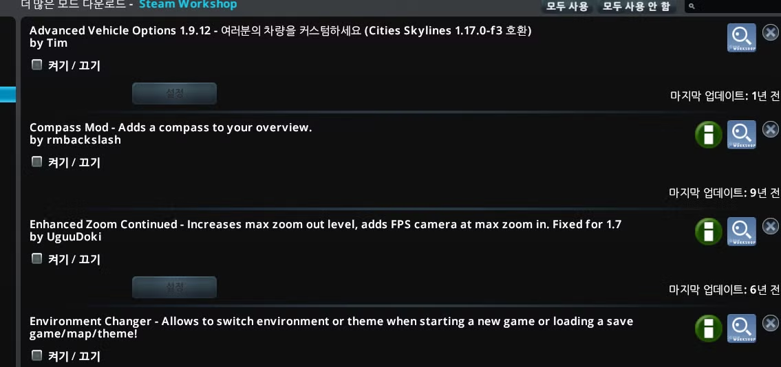 시티즈 스카이라인 1에서는 불친절하거나 불편한 점이 많아 모드 떡칠을 많이들 했었다. 조금이라도 딥하게 즐기기 위해서는 소위 필수모드라고 불리는 모드들을 깔아야했다. 리뷰를 위해 과거 건설했던 도시를 다시 보고 싶었으나, 이제는 업데이트를 지원하지 않는 모드들의 충돌로 인해 실패했다. 어쩔 수 없이 공식 소개 스크린샷들을 가지고 리뷰를 해보려한다. 대신 시티즈 스카이라인 2를 리뷰 할 때에는 직접 건설한 웅장한 도시들을 가지고 진행해보겠다.