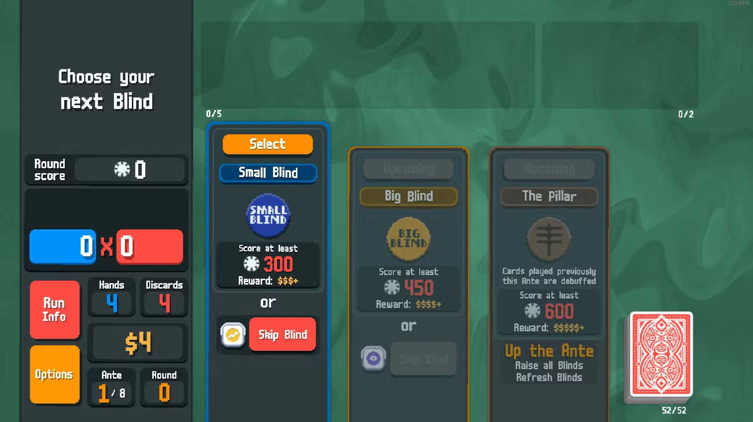 총 8 Ante까지 클리어 하는 것이 목표이며, 클리어 이후로도 Ante를 등반할 수 있지만 지수적으로 어려워진다.