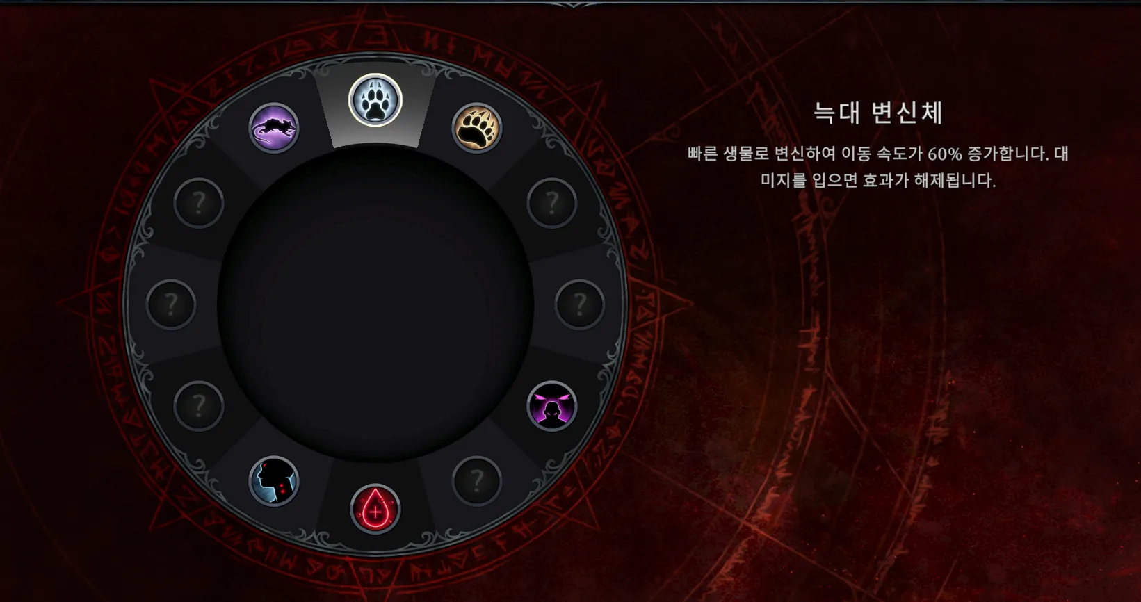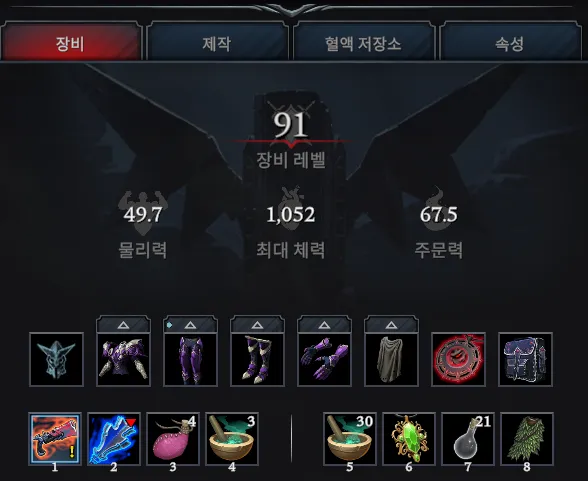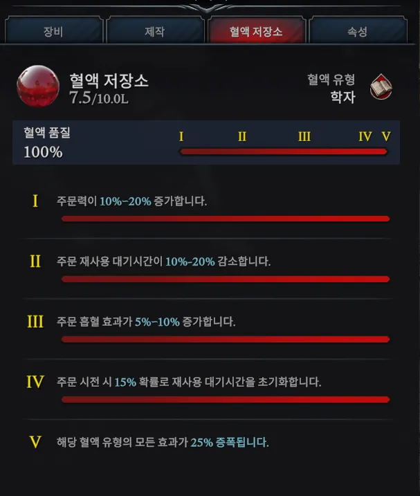 뱀파이어의 특징을 살려서, 생존을 위해 음식이 필요한 타 게임들과 달리 살아있는 생물의 피를 흡혈해야한다. 피 저장량이 0이되면 체력이 어마무시하게 까이니 끊임없이 다른 혈액을 흡혈하자. 흡혈한 혈액의 종류에 따라 버프를 획득할 수 있고, 혈액 품질에 따라 그 정도가 정해진다.