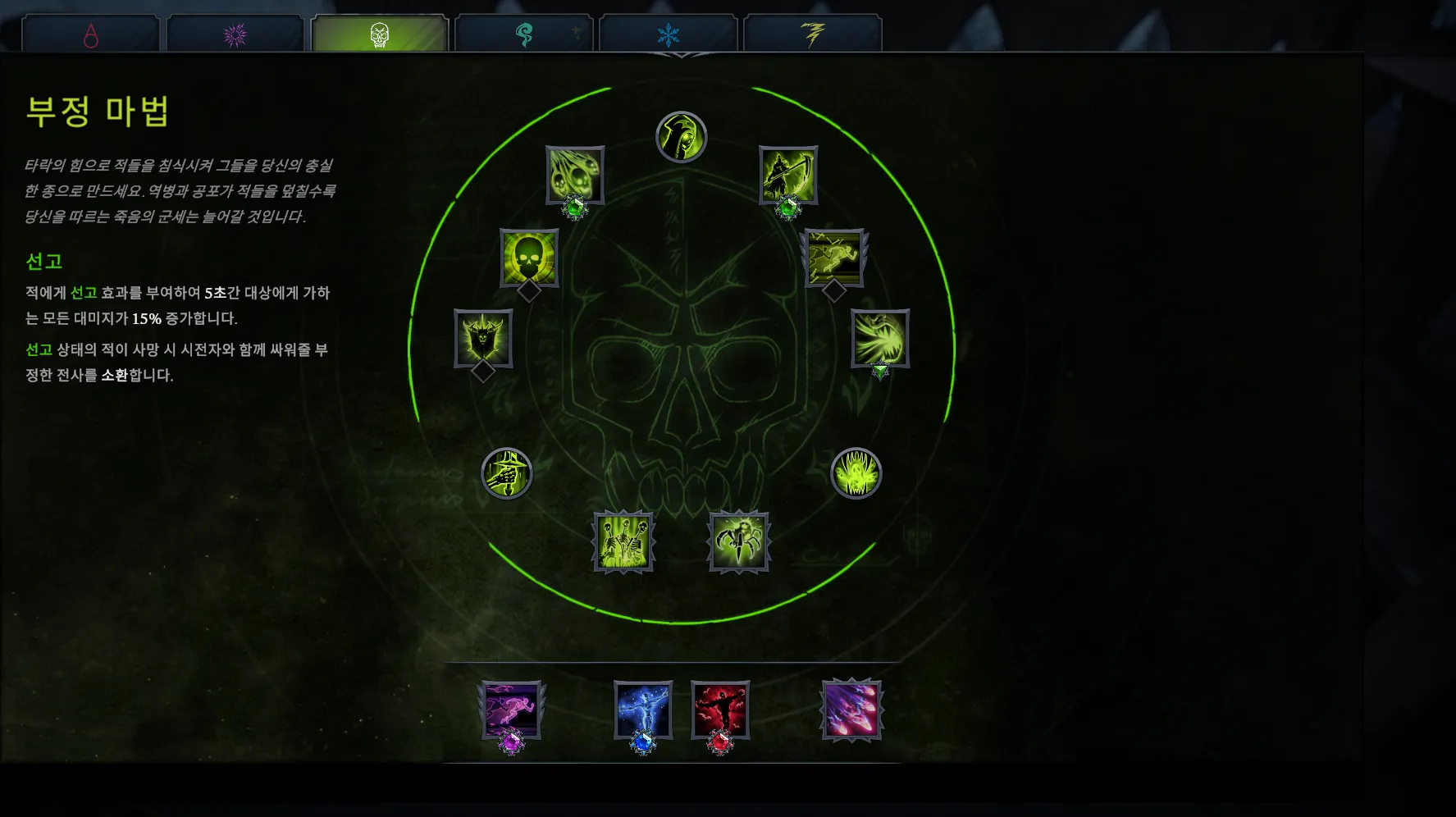 이 게임에는 총 6종류의 마법 분류가 있으며 각 분류에는 관련 디버프가 친절하게 설명되어있다. 총 48종의 주문 중 4개의 주문을 골라 싸울 수 있다. 테크를 올리다보면 각 주문에 장신구를 장착하여 강화할 수 있다.