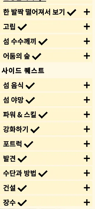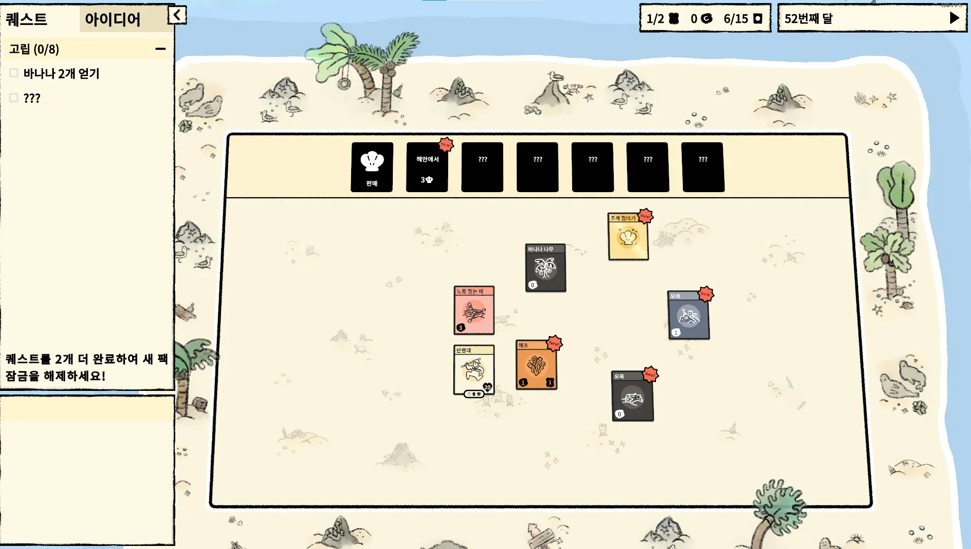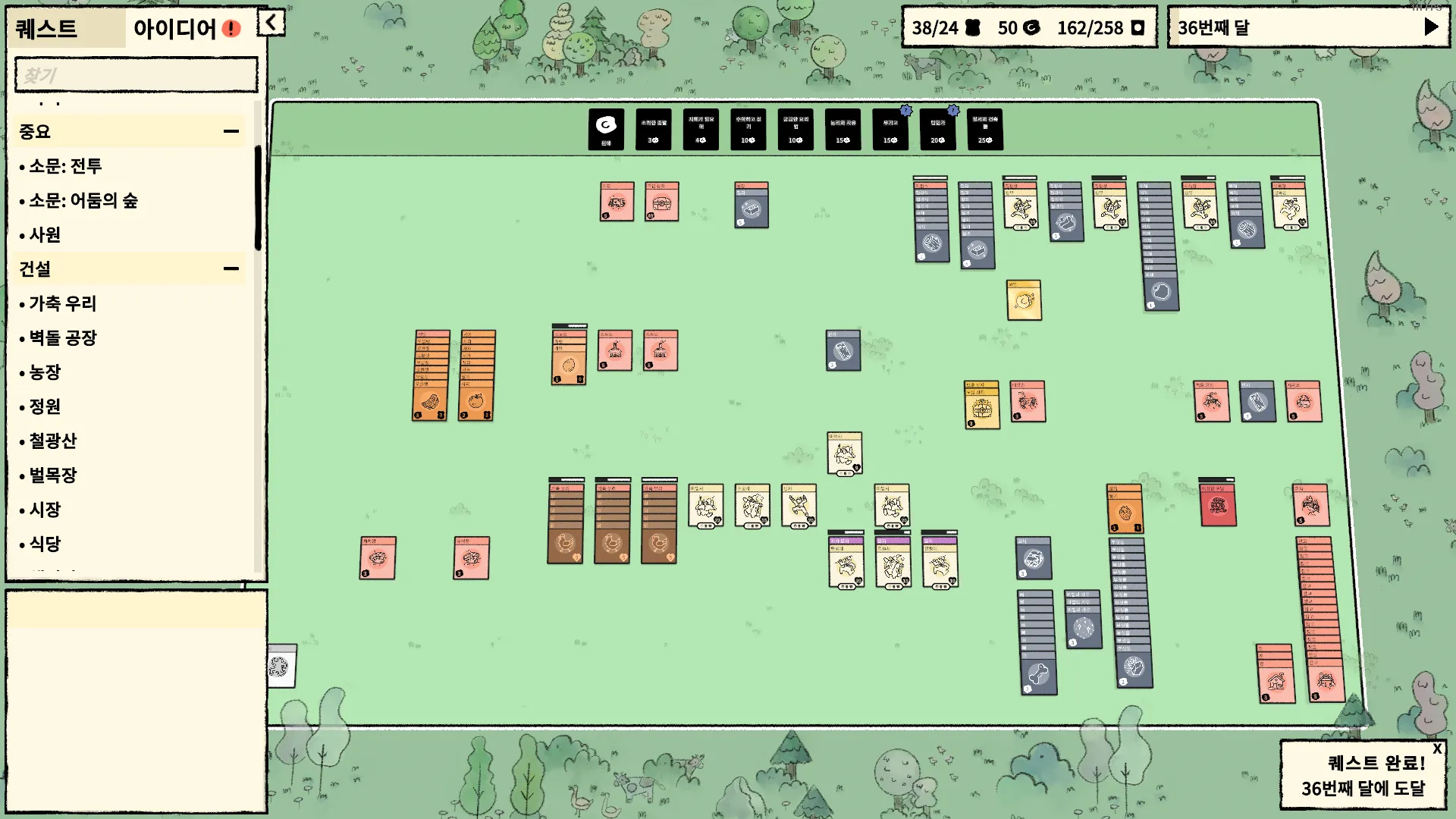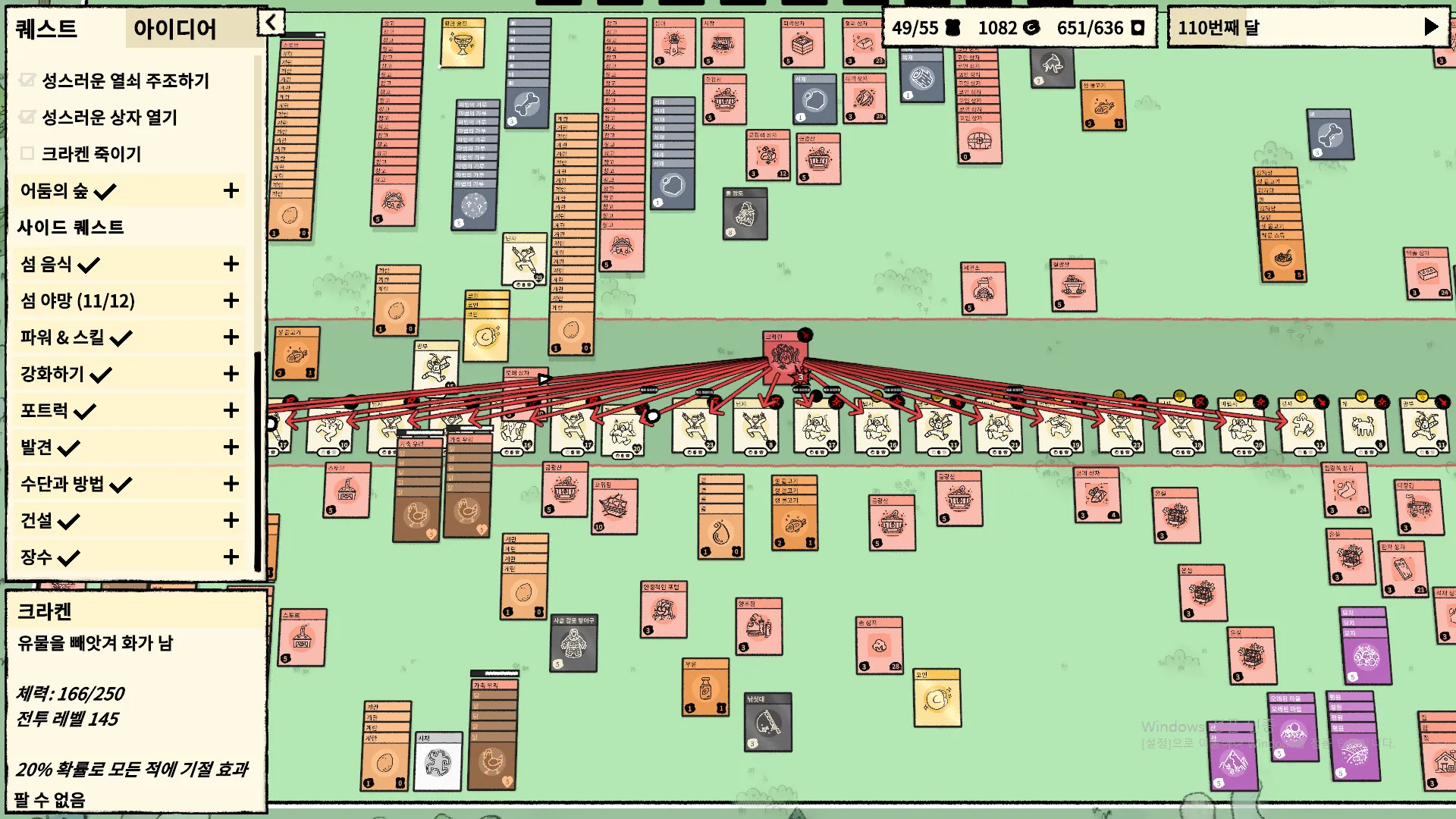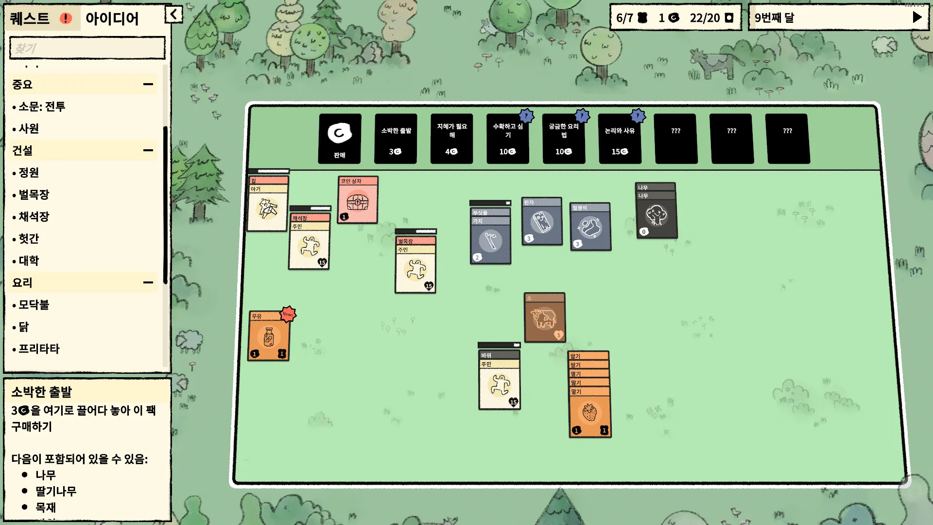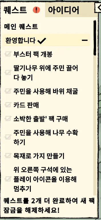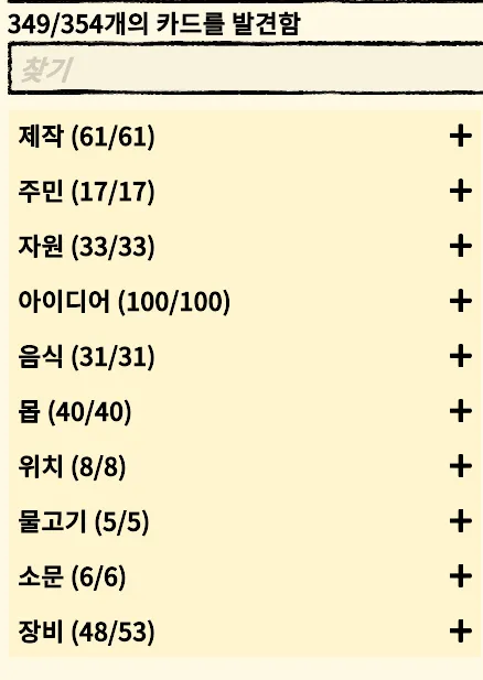 지금까지 얻은 아이디어 리스트를 확인할 수 있다. 주민이 다 죽으면 게임을 패배하지만 재 시작시 기존의 아이디어와 퀘스트 진행도는 남아있다. 사실 아이디어를 획득하지 않아도 검색해서 조합식을 찾으면 만들어낼 수 있다. 그리고 카드팩에 마우스를 올리면 어떤 카드들이 포함될 수 있는지 알려준다. 만약 발견하지 못한 카드가 있다면 물음표 표시가 뜬다.