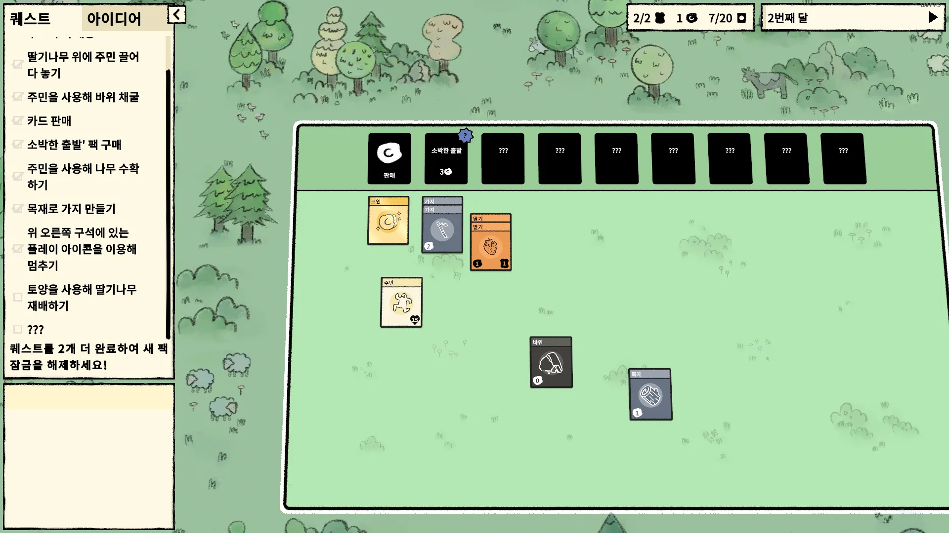 보드게임 판 위에서 카드 팩을 까며 카드를 수집한다. 특정 조합의 카드들을 겹치면 다른 카드를 만들 수 있다. 예를 들어, 딸기나무와 주민을 겹치면 딸기를 생산해낸다. 어떤 조합식이 필요한지는 아이디어 카드를 얻어 확인할 수 있다. 좌측의 퀘스트 목록을 깨면서 게임을 진행하면 된다.