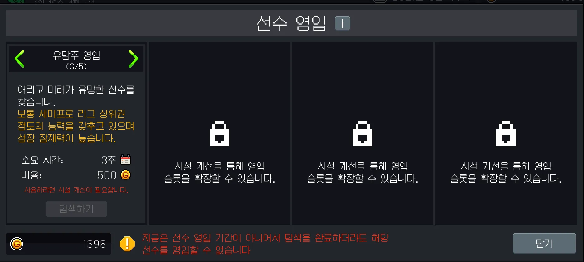 평소에 볼 수 있는 인터페이스는 위와 같다. 돈을 벌어 선수를 육성해나가는 것을 메인으로 게임이 진행된다.
