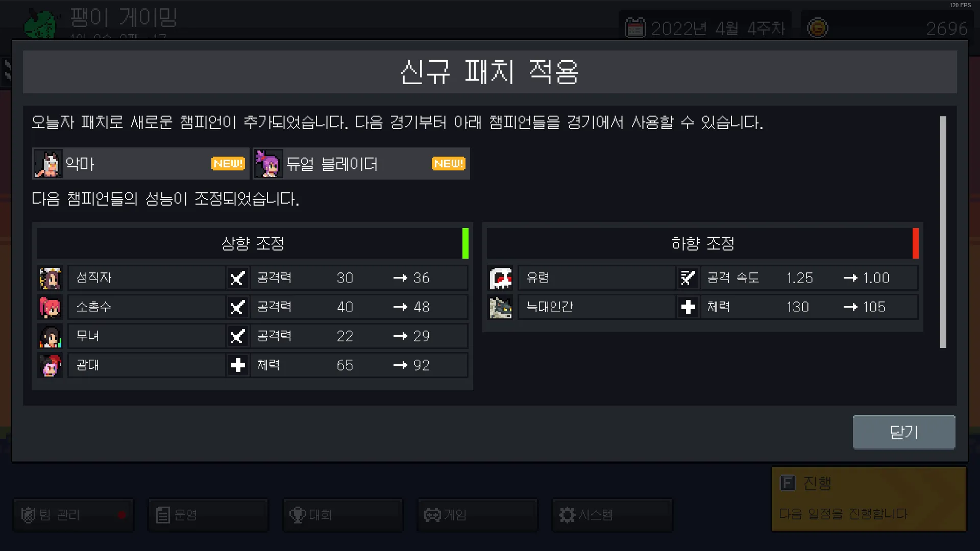 2인개발 인디게임이라는 측면에서 정말 대단하다고 느꼈다. 각 챔피언 별 특성을 살려 전투를 보는 맛이 있다. 밴픽이 정말 중요하고 전략적인 밴픽을 통해 경기를 승리로 이끌어나가면 짜릿하다. 하지만 선수 육성의 측면에서는 사실 크게 재미를 느끼지 못했다. 그리고 적이 밴픽을 그렇게 잘한다는 느낌은 못받았으며, 결국 하던 픽을 계속 하게 되는 흐름이 생기더라. 피어리스 모드를 적용하면 조금 천천히 질리기는 한다. 그래도 20시간 정도는 거뜬하게 즐길 수 있어, e sports를 좋아하거나 시뮬레이션 게임을 좋아한다면 꼭 해보기를 추천한다.