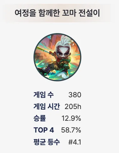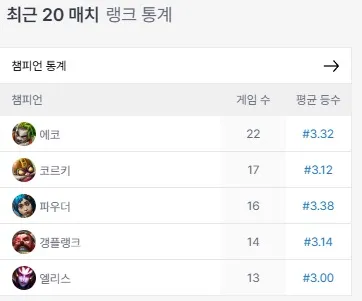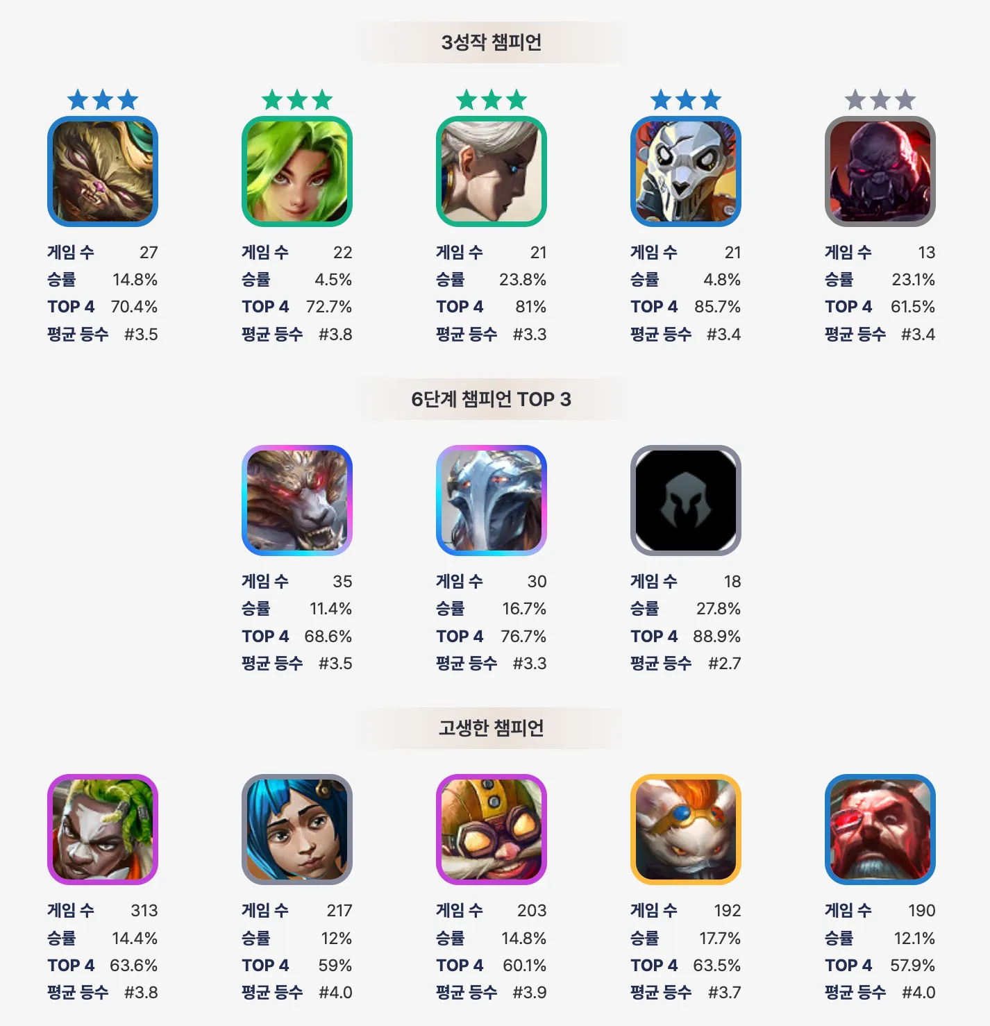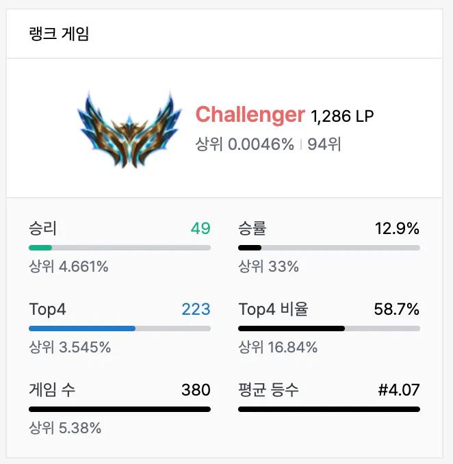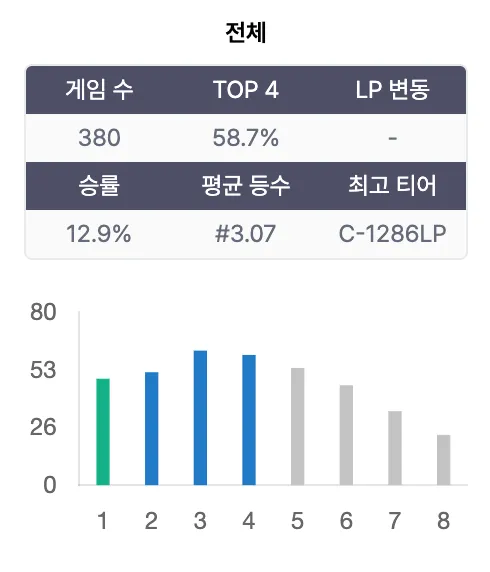 lolchess.gg 사이트에서 흥미로운 통계를 많이 제공해주었다. 나는 저번에 챌린저를 찍을 때도 마찬가지였지만, 1등 비율이 그리 높은 편은 아니다. 다만 3,4등을 정말 많이하고 7,8등을 거의 하지 않는 스타일로 점수를 올려왔다.