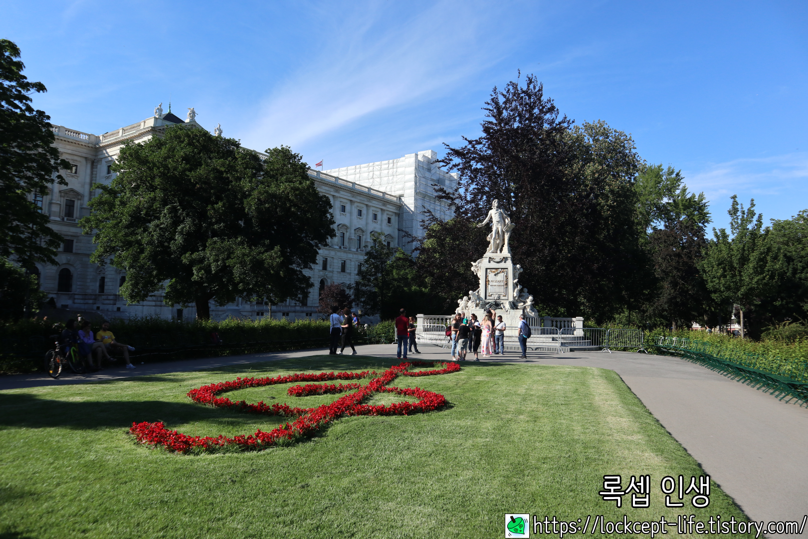 높은 음자리표 모양의 화단과 모차르트 동상이 있다.