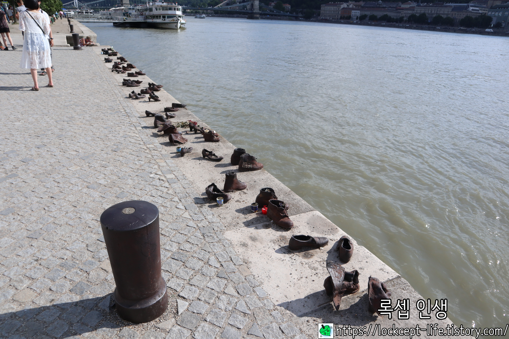 이 곳에서 유대인들의 신발을 벗기고 뒤에서 총을 쏴서 강물로 빠뜨렸다고 한다. 이를 추모하기 위한 신발들이다.