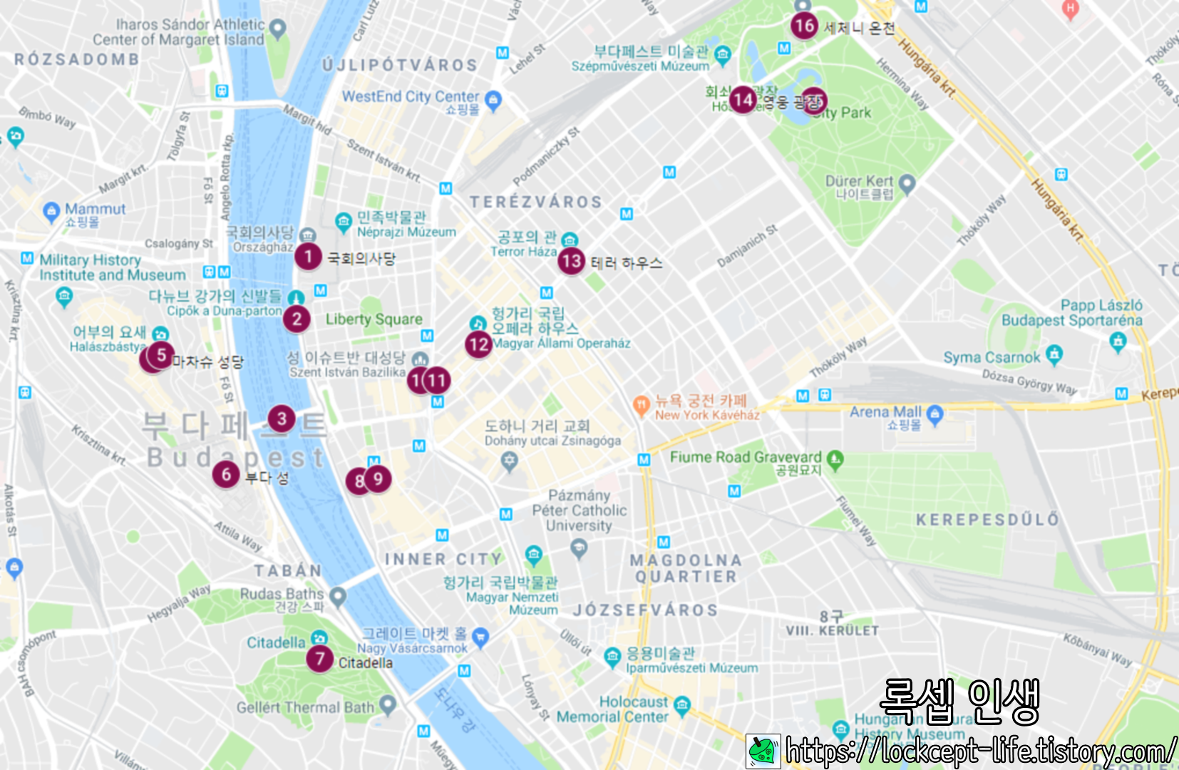 부다 페스트 시내 여행코스. 반나절 정도면 갈 수 있는데, 너무 피곤해서 이틀에 나누어 다녔다. 하지만 반나절에도 충분히 다닐 수 있는 코스이다.