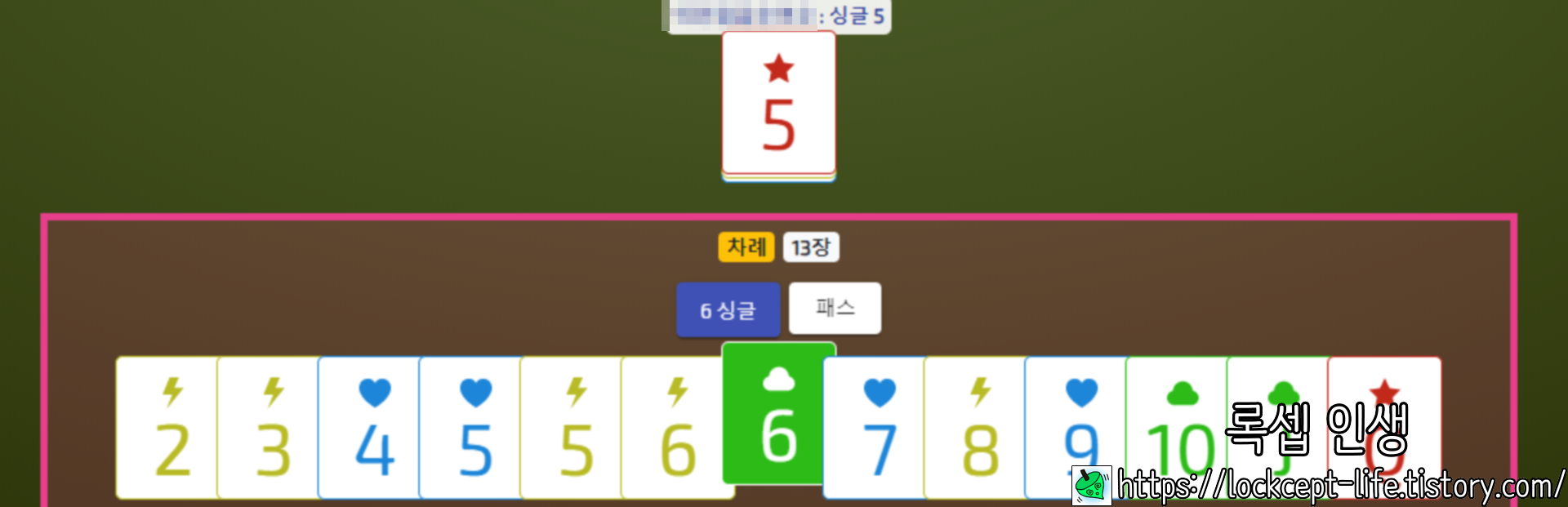 싱글 카드는 숫자가 더 크면 높은 카드이다. 위 사진의 경우 6, 7, 8, 9, 10, J, Q 중 하나를 내거나 패스할 수 있다.