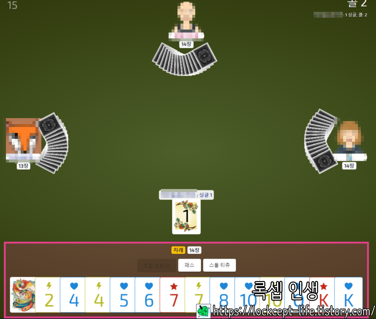 보통 1을 싱글로 낼 경우 자신이 오른쪽에 준 카드를 콜 하는 것이 적당하다.
