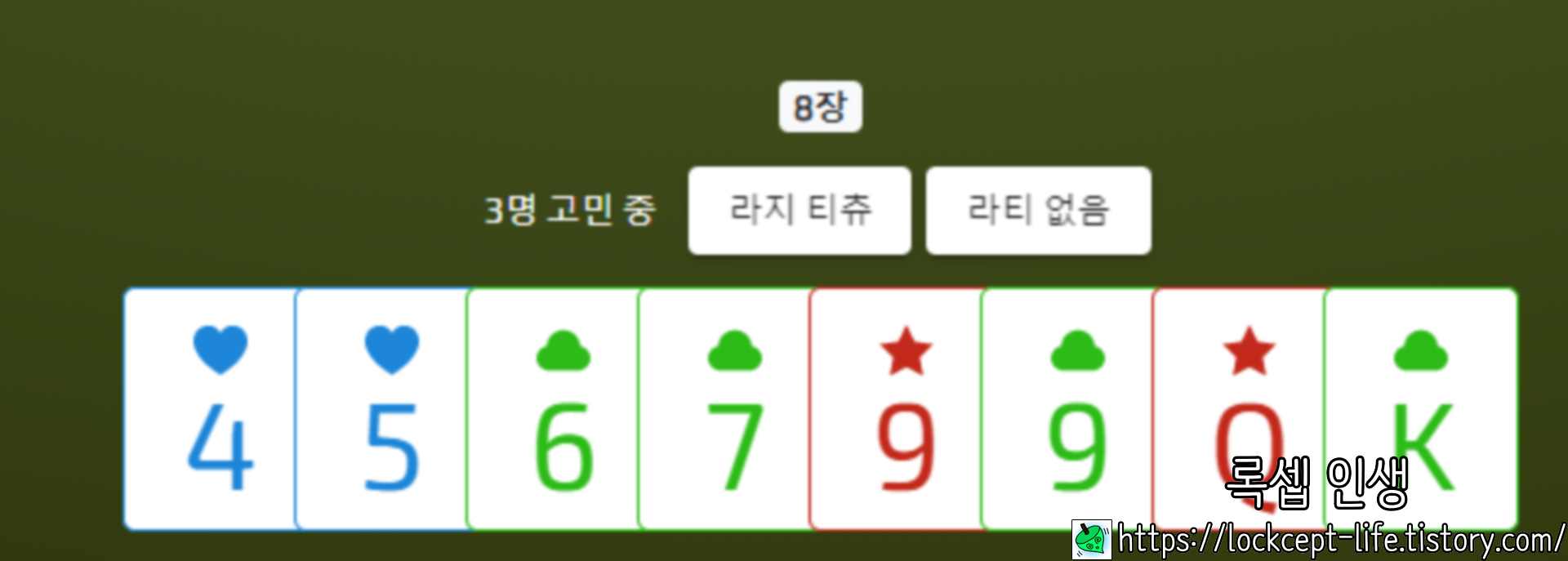 그런데 만약 오른쪽 사람에게 없는 카드를 콜 했다가 맞은편에 있는 우리팀의 카드가 빠진다면 족보가 깨져 쌍욕을 할 지도 모른다.