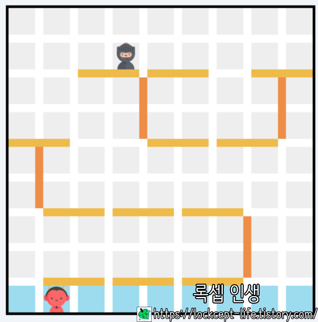 이런 구도가 나오면 주로 닌자가 승리한다. 가운데 길은 양쪽 다 통과해야하지만 악마는 닌자의 길을 더 이상 치명적으로 방해할 방법이 없다.