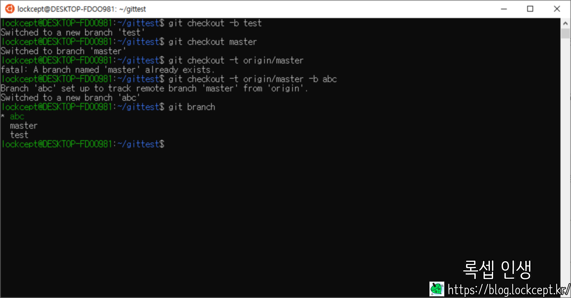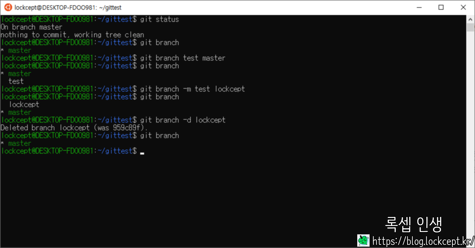 git branch -m 옵션으로 이름을 변경할 수 있으며, git branch -m test lockcept 이후 git branch 로 확인하자 test가 lockcept이 되어있는 모습이다.