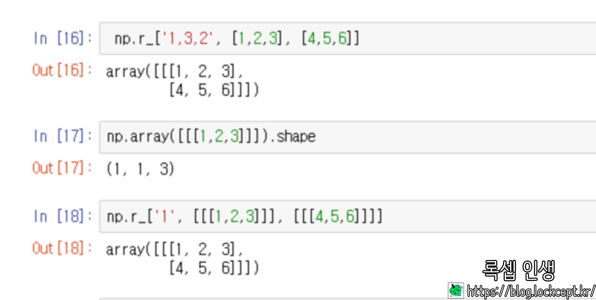 예를 들어 위 예제의 경우 1차원 ndarray들이 인자로 들어왔지만, 2차원으로 확장한 후 합치겠다는 의미이다.