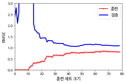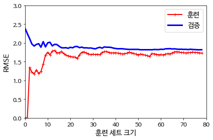 과소 적합의 경우 두 곡선이 높은 오차에서 평행하게 된다. 훈련은 잘 했지만 모델 자체가 오차를 줄일 수 없기 때문이다. 과대적합의 경우 훈련 데이터의 오차가 작아지는데 검증 데이터의 오차와 차이가 있다.