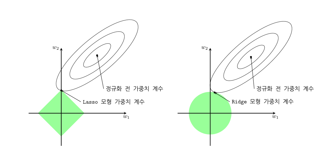 라쏘 회귀는 릿지 회귀와 비슷하지만 파라미터 제곱이 아닌 파라미터 절댓값에 비례한 비용을 추가하는 것이다. 릿지 회귀는 가중치가 원점에 가까이 가려고 한다면 라쏘 회귀는 필요없는 가중치를 완전히 제거하려는 특성을 가진다. 특정 곡선이 원에 접하는 점을 찾는 경우와, 다이아몬드에 접하는 점을 찾는 경우를 비교해보면 될 것이다.