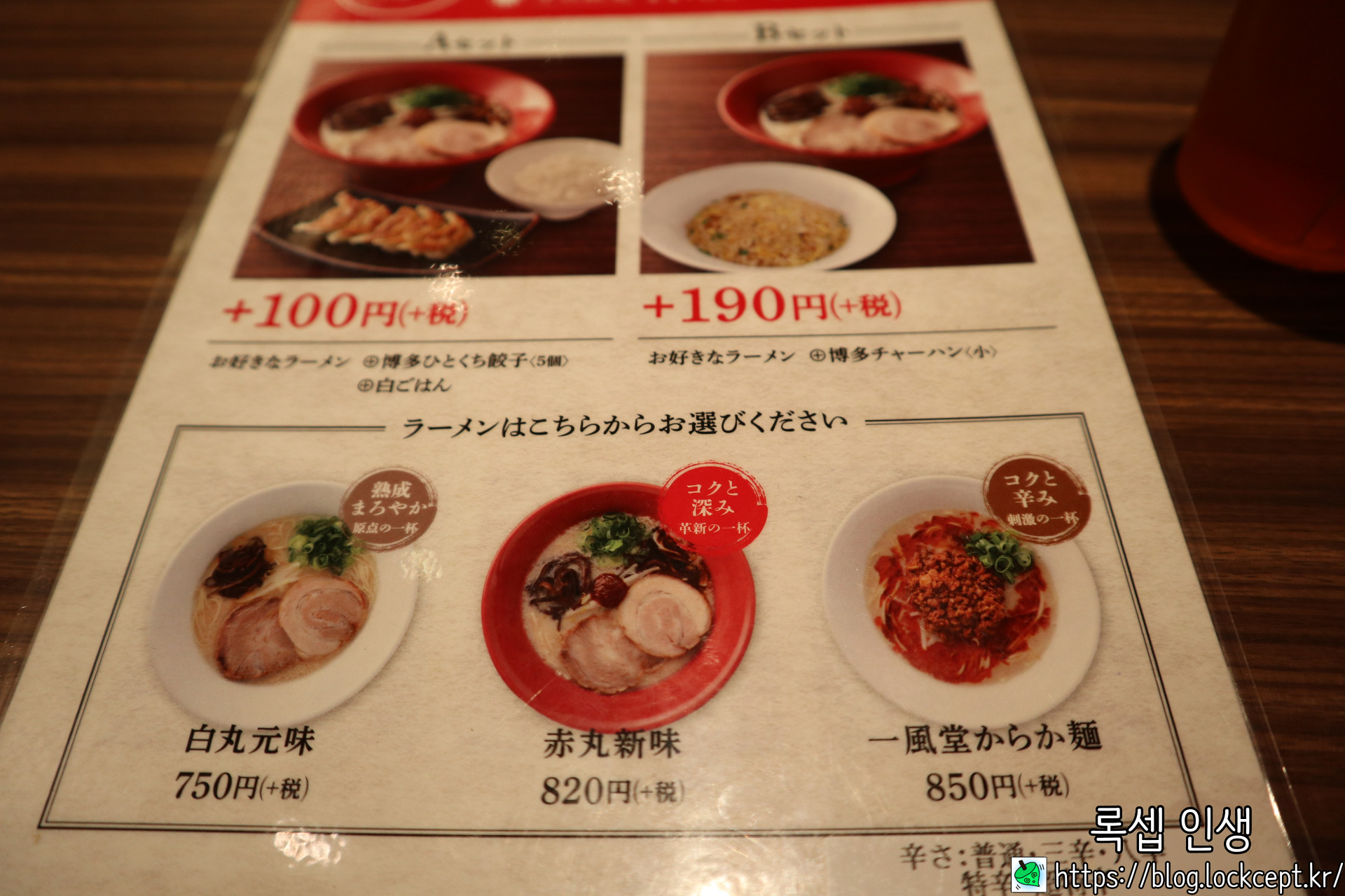 아래 세 종류의 라멘이 있고 밥과 만두추가는 100엔, 볶음밥 추가는 190엔이다.